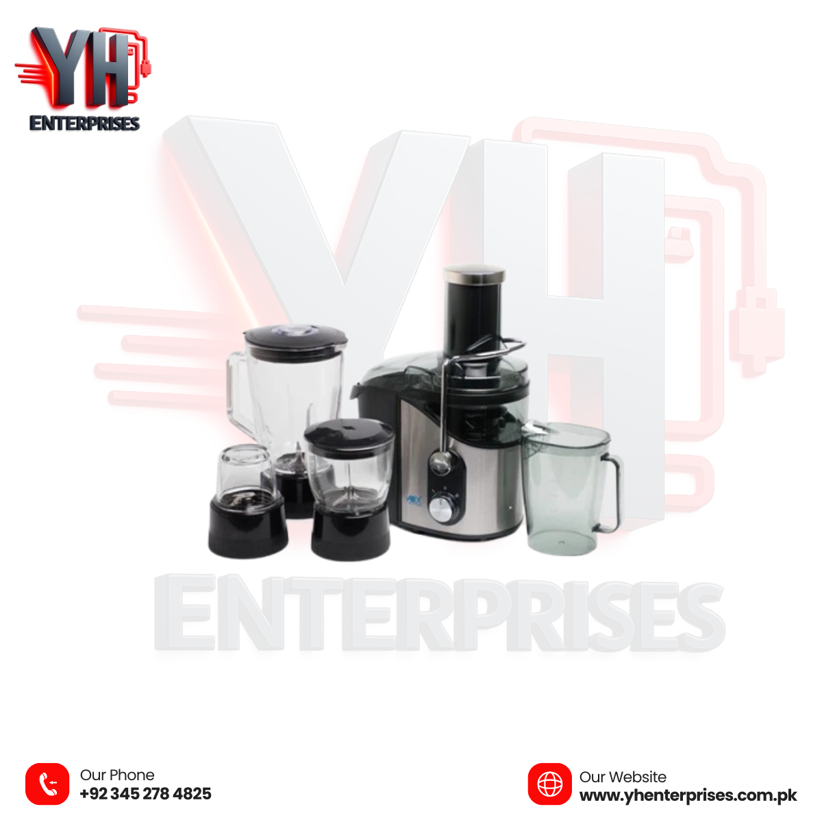Juicer, blender, and wet & dry grinder in one compact unit.