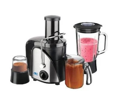 220-240V 50/60 Hz 600W 2 Years Warranty Features: Juice extractor, blender, grinders. Stainless steel housing. Two speeds control. 75mm diameter feed tube for the whole apple. Stainless steel micro-mesh filter basket. Built-in safety system. 1000ml juice cup, 1500ml pulp container. 1250ml glass blender jug, 120g glass grinder
