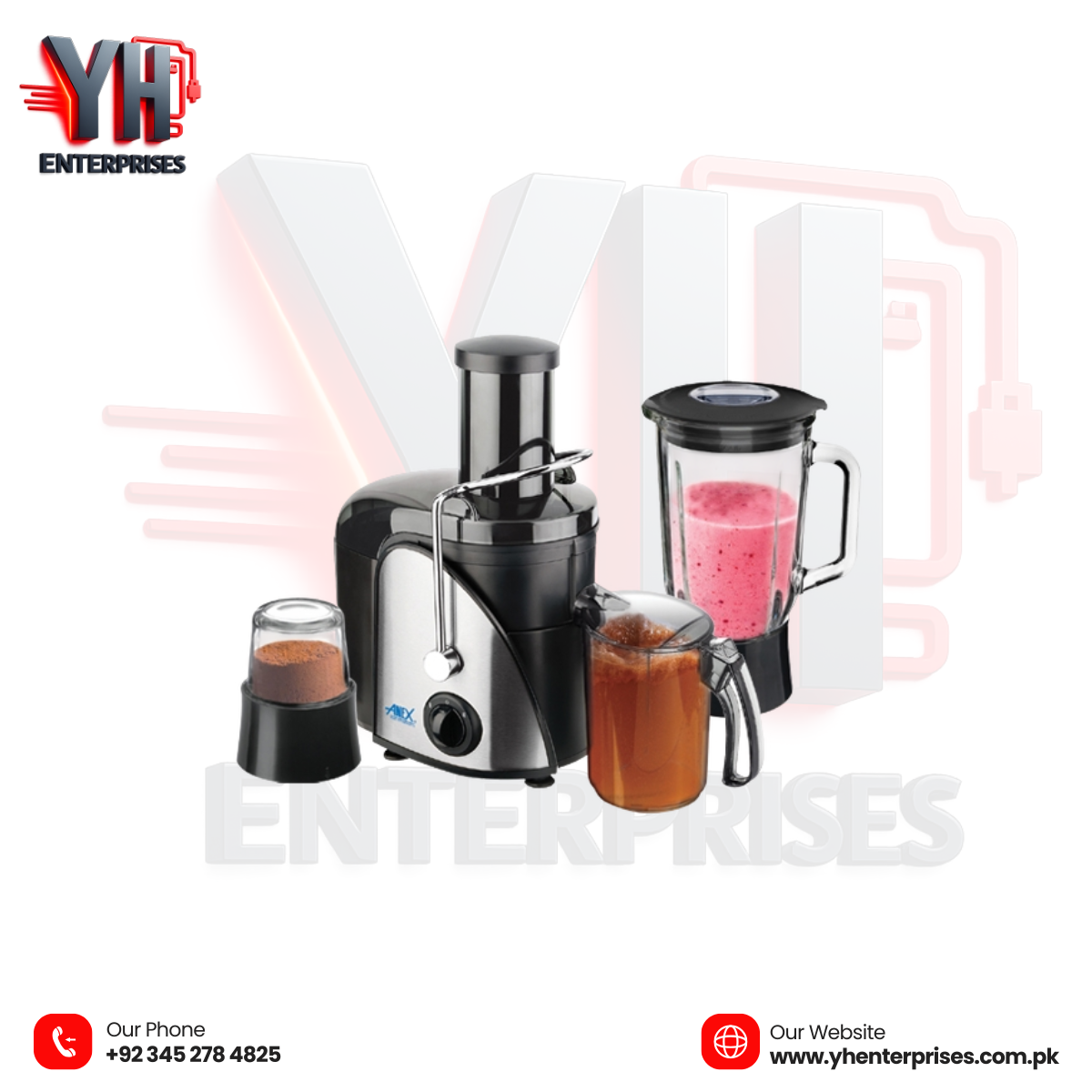 Juice extractor, blender, and grinder in one compact unit.