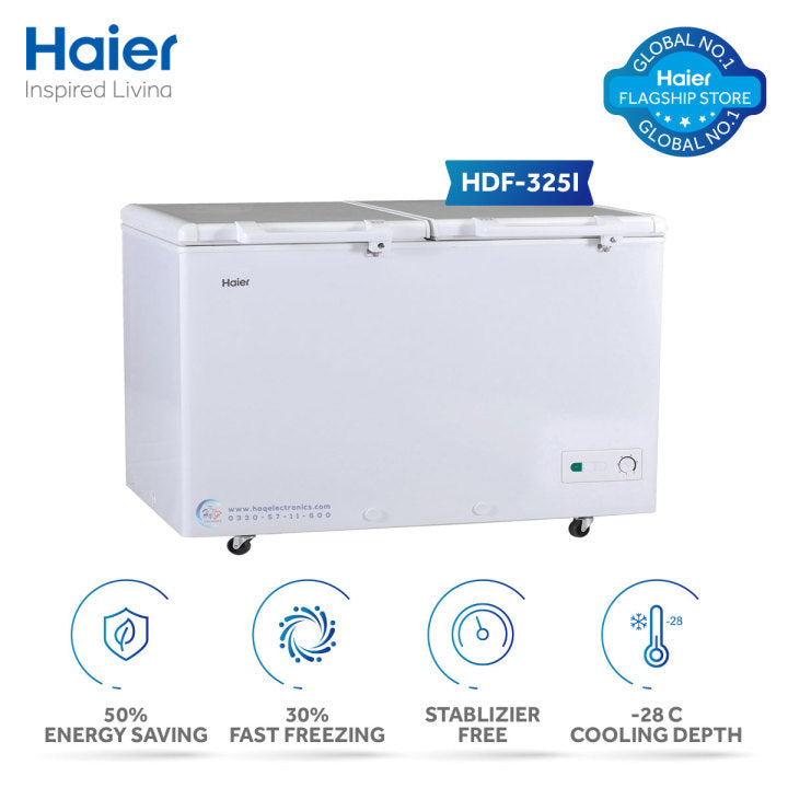 Haier Deep Freezer 12 Cu Ft/Inverter/Twin Door/HDF-325I (50% Energy Saving/ 30% Fast Freezing/ -28 c Cooling Depth ) White Colour Deep Freezer/10 Years Warranty